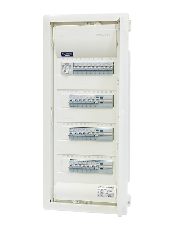 Ryhmäkeskus IP30. Uppoasennukseen. ovella. Nimellisvirta 35A.Johdonsuojakatkaisijoita 27 kpl. vikavirtasuojakytkimiä 3 kpl (4-nap.30mA 25A). Ryhmäkeskus IP30. Uppoasennukseen, ovella. Upotuskaukalo muovia, ovi ja kehys terästä. Nimellisvirta 35A. Johdonsuojakatkaisijoita 27 kpl, vikavirtasuojakytkimiä 3 kpl (4-nap. 30mA 25A). Upotusaukko 315x720x87 mm.