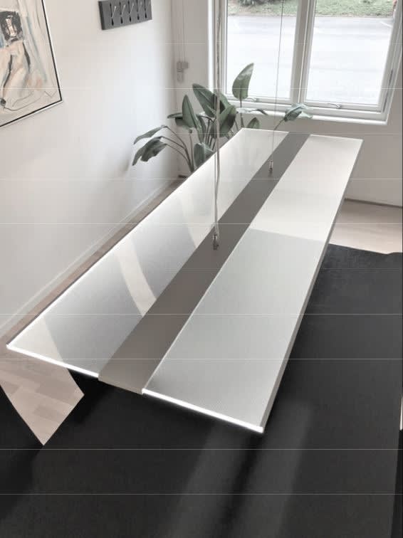 Tyylikäs ripustusasennettava toimistovalaisin, joka antaa valoa tasaisesti sekä ylös että alas. Valonjako on toteutettu runkoa reunustavilla akryylisiivekkeillä. Kiinteä led.