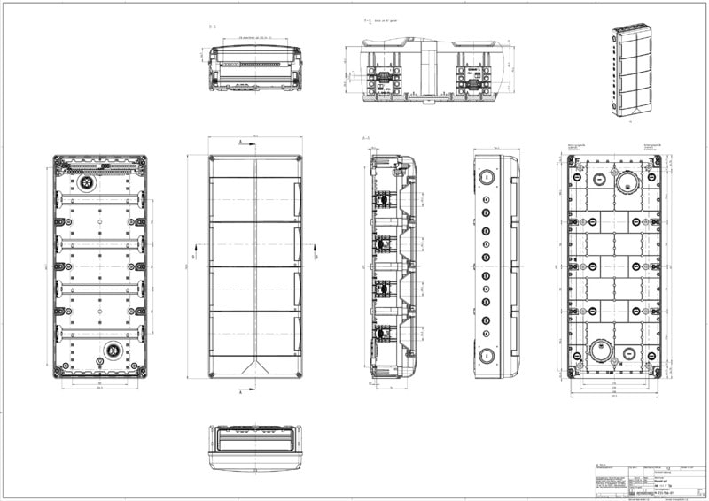 Moduulikotelo - teollisuusmalli -, laipan malli, avoimilla päädyillä, joissa voidaan käyttää erilaisia laippoja, useampien AK-F-moduulikoteloiden liittämiseksi yhteen yhdistyslaipan avulla, 4-rivinen, 56 moduulia, DIN-asennuskiskojen väli 150 mm, integroiduilla tuuletusventtiileillä kondenssiveden muodostumisen vähentämiseksi, DIN-peitelevy ja merkintäliuska, ylimääräisillä kaksoiskalvotiivisteillä ja muilla tarvikkeilla, laipat ja yhdistyslaipat on hankittava erikseen.