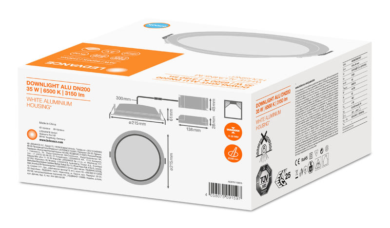LEDVANCE DOWNLIGHT ALU 200 35W 6500K LED-alasvalon teho on 35W ja se tuottaa 3150lm valovirran (90lm/W). Valaisin on IP44 -luokiteltu ja sen upotushalkaisija on 200mm (valaisimen halkaisija 215mm). Valaisimen keskimääräinen elinikä on 50000 h. LEDVANCE Downlight Alu on uusi toisen sukupolven LEDVANCE-alasvalo. Uuden SCALE DESIGN –muotoilun ansiosta LEDVANCE Downlight Alu-malliston valaisimien fyysistä kokoa on saatu pienemmäksi. Uudet Downlight Alu -valaisimet ovat nyt huoneen puolelta IP44-luokiteltuja.