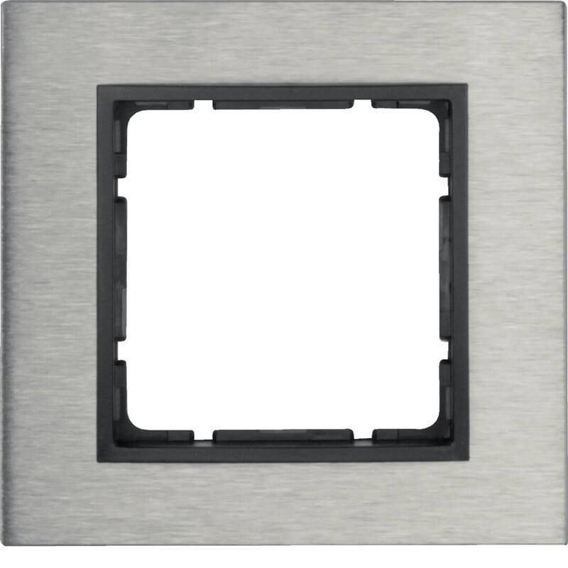 Peitelevy 1-osainen, B.7, ruostumaton teräs/antrasiitti matta Peitelevy Berker B.7, 1-osainen. Pintamateriaali ruostumattomasta teräksestä pystyharjatulla pinnalla ja antrasiitin värinen pohjalevy halogeenittomasta thermoplast-muovista. Käyttö Berker S.1 -kalustesarjan antrasiitin värisellä 55x55 keskiölevyllä varustettujen kojeiden kanssa.