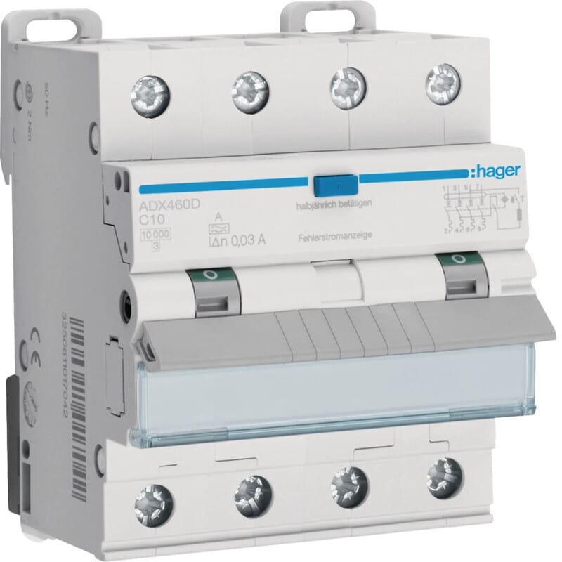 HAGER - Vikavirtajohdonsuojakatkaisija - ADX460D 30mA A/4x10A C-k. 10kA