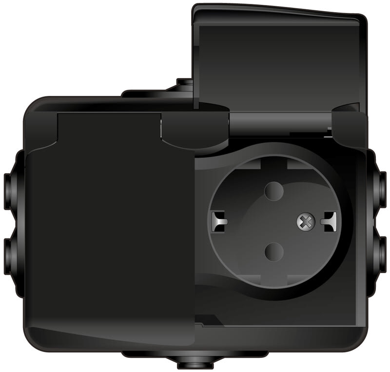 Pinta-asennettava koteloitu 2-osainen maadoitettu pistorasia turvasuluin. Kotelointiluokka IP44. Pistorasiassa on ruuviliittimet. Liittimet ovat hyväksytty sekä ML että MK johtimille. Pistorasiassa on kalvoläpiviennit kaapeleille ylhäällä, alhaalla ja sivuilla.