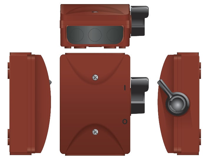 Kotelon ylä- ja alaosassa on kolme kalvoläpivientiä, erillisiä holkkitiivisteitä ei tarvita. Sisällä vedonpoistimet kaapelien kiinnittämiseksi. Väri punamulta.