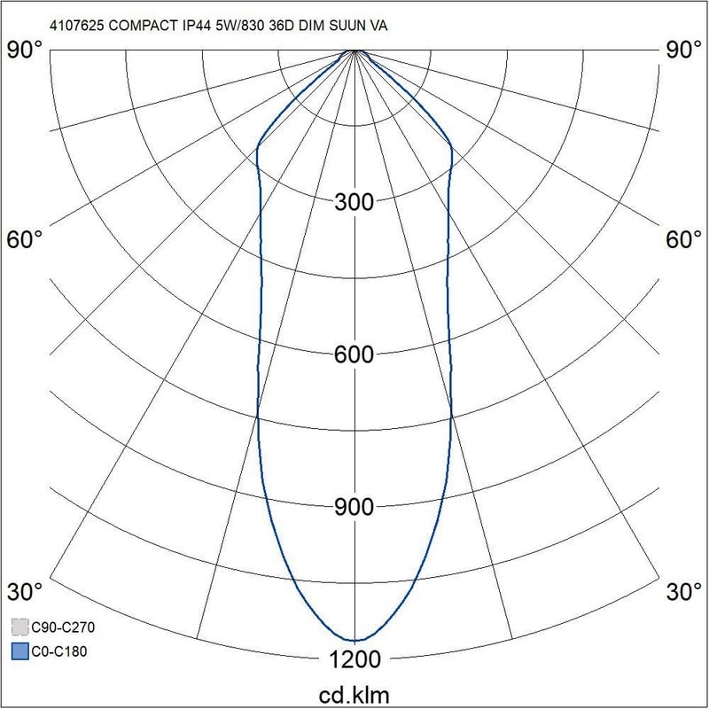 Compact Tilt 5W 3000K 400lm Keskileveä säde 20-40°; Him nousevan ja laskevan reunan ohjaus; IP44; IK02; SL II; L70B50 90000h; LED kiinteä; CRI>80; SDCM3; Soveltuu läpijohdotukseen; 3x1.5mm²; Kotelo al; Väri val; Suojus Läpinäkyvä muovi; C16 maks. 200