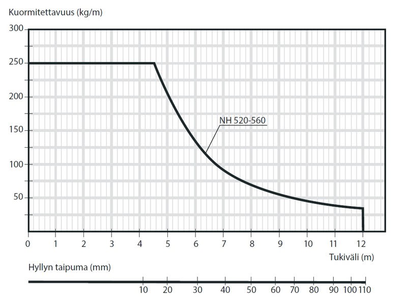 IEC 61537:n mukainen turvallinen työkuorma, kun tukiväli on 12,0 m.: