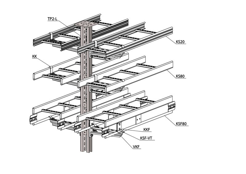 Kattokannakkeella TP2-L kiinnitetään kattoon tikas-, levy- ja lankahyllyjä seinäkannakkeilla VKZ, VK ja VKF. Kaapelihyllyjä voidaan kiinnittää kannakkeen molemmille puolille useaan eri kerrokseen. Soveltuu kiinnitettäväksi sekä kattoon että lattiaan.