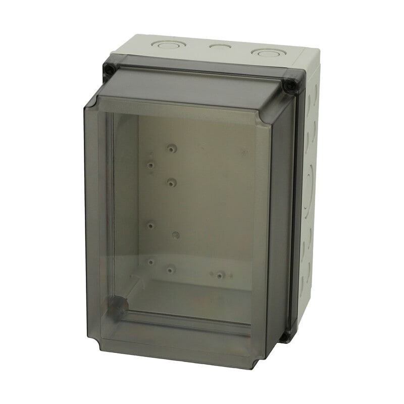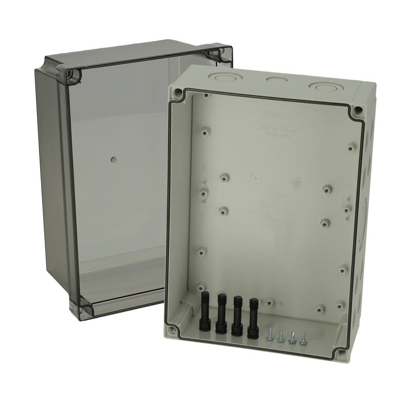 MNX PCM polykarbonaattikotelo, 255x180x175, metriset läpilyöntiaihiot, extra korkea alaosa, savunharmaa läpinäkyvä kansi, alaosa PUR-tiivisteellä, 4 kpl ruuvit asennuslevylle/DIN-kiskolle, 4 kpl polyamidi kansiruuvia, IP66/67, IK08
