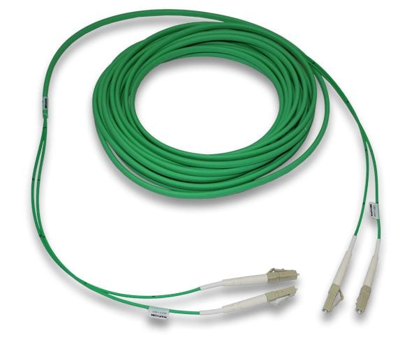 OM1-kytkentäkaapeli, duplex tuplasuojalla, jossa molemmissa päissä on LC-UPC liittimet.