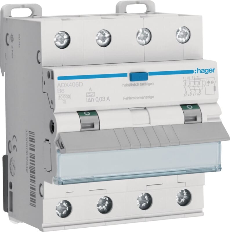 HAGER - Vikavirtajohdonsuojakatkaisija - ADX406D 30mA A/4x6A B-k. 10kA
