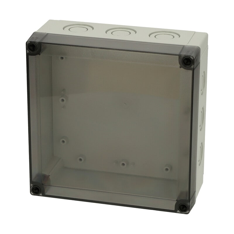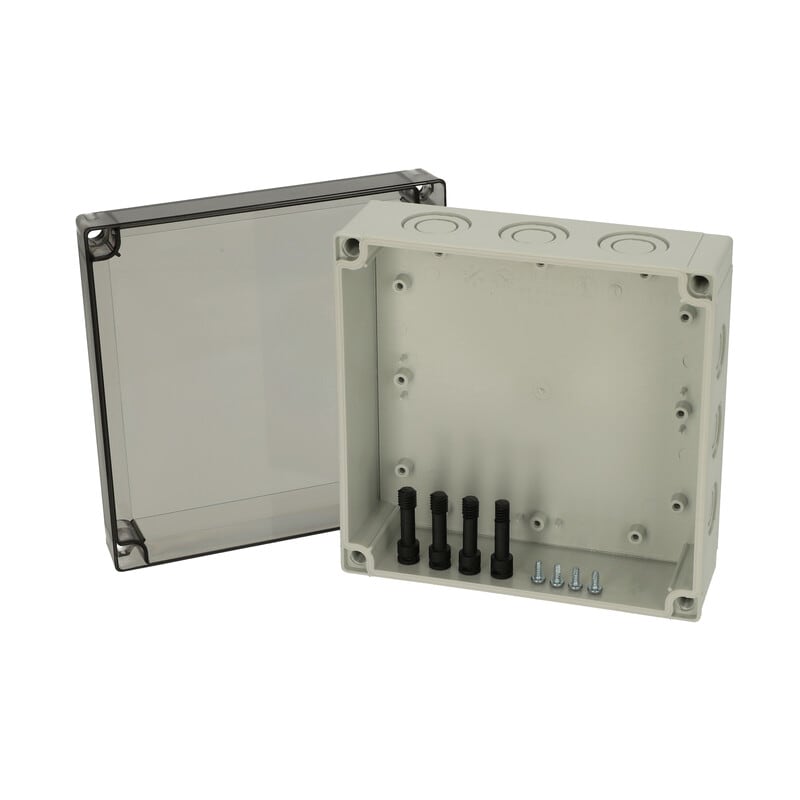 MNX PCM polykarbonaattikotelo, 180x180x75, metriset läpilyöntiaihiot, savunharmaa läpinäkyvä kansi, alaosa TPE-tiivisteellä, 4 kpl ruuvit asennuslevylle/DIN-kiskolle, 4 kpl polyamidi kansiruuvia, IP66/67, IK08