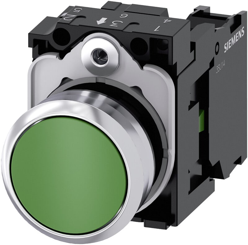 Painike, 22 mm, pyöreä, metalli, kiiltävä, vihreä, painike, litteä, hetkellinen kosketintyyppi, 1 NO, ruuviliitin