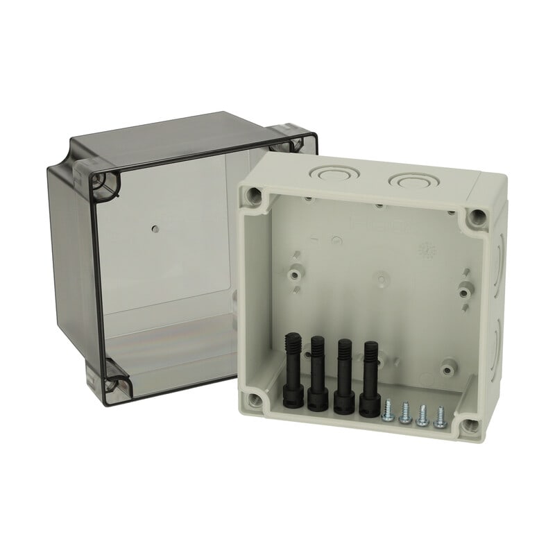 MNX PCM polykarbonaattikotelo, 130x130x125, metriset läpilyöntiaihiot, savunharmaa läpinäkyvä kansi, alaosa TPE-tiivisteellä, 4 kpl ruuvit asennuslevylle/DIN-kiskolle, 4 kpl polyamidi kansiruuvia, IP66/67, IK08