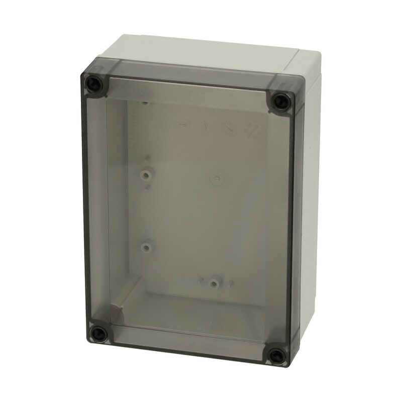 MNX PC polykarbonaattikotelo, 180x130x75, Korkea alaosa, Savunharmaa läpinäkyvä kansi, Alaosa ilman läpilyöntiaihioita, Alaosa TPE-tiivisteellä, 4 kpl ruuvit asennuslevylle/DIN-kiskolle, 4 kpl mustaa polyamidi kansiruuvia, IP66/67, IK08 FIBOX MNX PC polykarbonaattiasennuskotelot