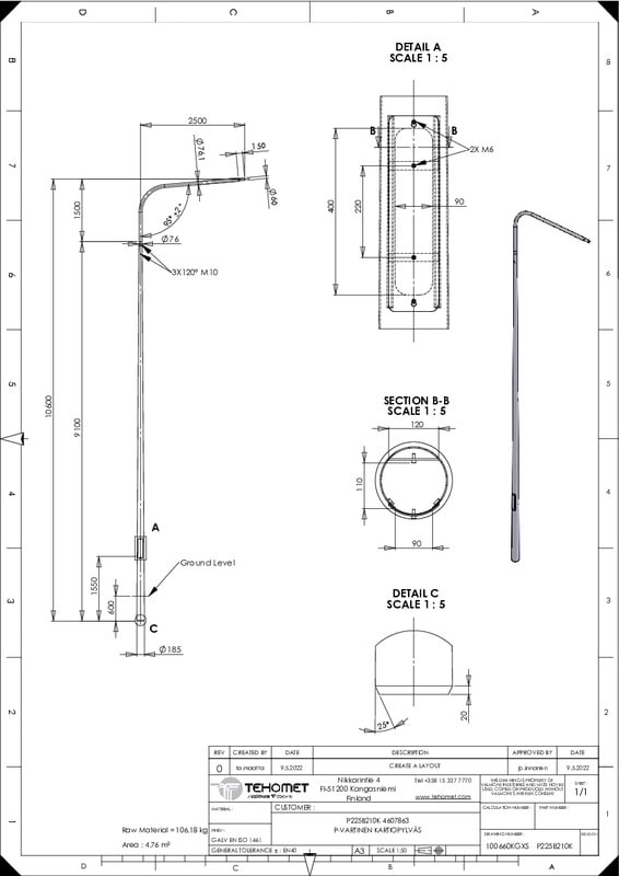 TEHOMET - Teräskartiopylväs - P225B210 teräskartiopylväs
