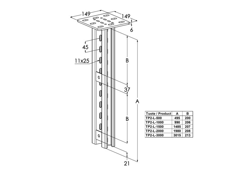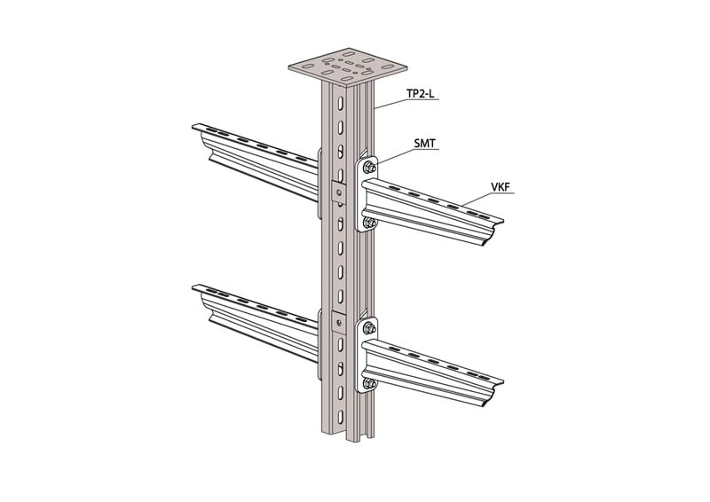 Kattokannakkeella TP2-L kiinnitetään kattoon tikas-, levy- ja lankahyllyjä seinäkannakkeilla VKZ, VK ja VKF. Kaapelihyllyjä voidaan kiinnittää kannakkeen molemmille puolille useaan eri kerrokseen. Soveltuu kiinnitettäväksi sekä kattoon että lattiaan.