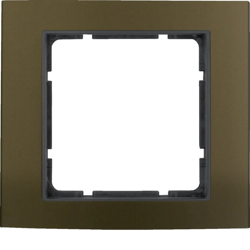 Peitelevy Hager B.3 1os. 81mm ruskea-Al/antrasiitti Peitelevy Berker B.3, 1-osainen. Pintamateriaali ruskeaksi anodisoidusta alumiinista ja antrasiitin värinen pohjalevy halogeenittomasta thermoplast-muovista. Käyttö Berker S.1 -kalustesarjan antrasiitin värisellä 55x55 keskiölevyllä varustettujen kojeiden kanssa.