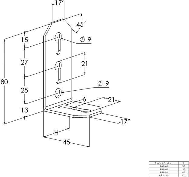 Päätykiinnike levyhyllyyn, terästä, sinkitty Päätykiinnikkeellä RÄF kiinnitetään levyhyllyjen KRA ja KRB pääty seinään, lattiaan tai kattoon.