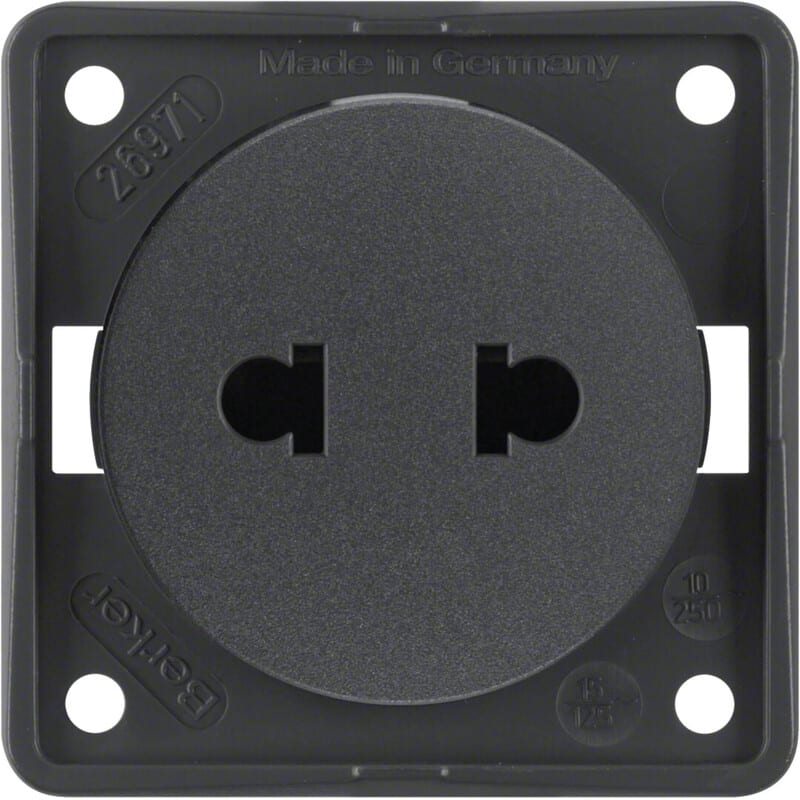 Pistorasia 2-napainen euro-amerikkalainen -standardi kosketussuojilla, ilman maadoitusliuskoja. Liitäntäruuviliittimillä, värimatta antrasiitti. Pistorasia ilman maadoituskosketinta EURO-AMERICAN STANDARD 74 - Korotettu kosketussuojaus - ruuviliittimet Nimellisjännite 250 VAC Nimellisvirta 10 A Ei sovellu SCHUKO-tulpalle DIN 49441 mukaan. Standardi GB 1002 Kytkentäliittimet IEC 60884-1 mukaan − 2-napainen