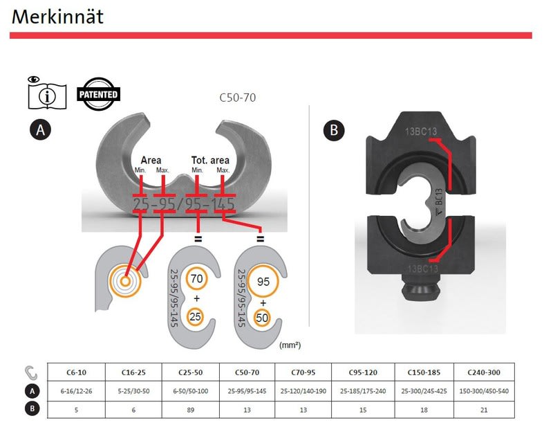 Haaroitusliitin maadoitusköysien jatkoksiin ja haaroituksiin sekä ukkosenjohdatinasennuksiin. Käytä V250-järjestelmässä leukaparia BC13 (leukapidin tarvitaan) tai V1300-järjestelmässä leukaparia 13BC13 yhdessä Elpress-puristustyökalun kanssa.