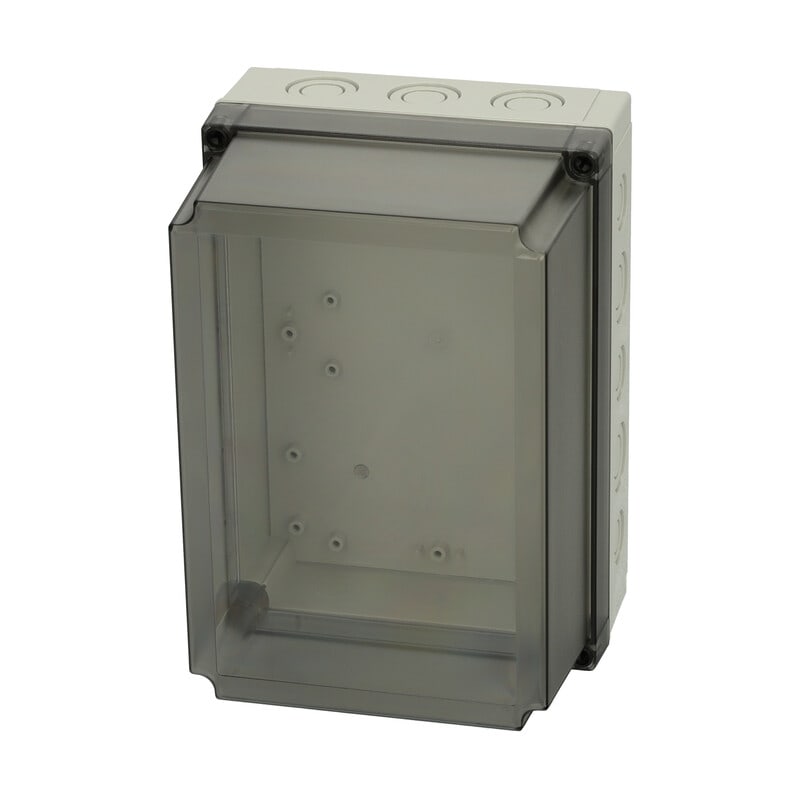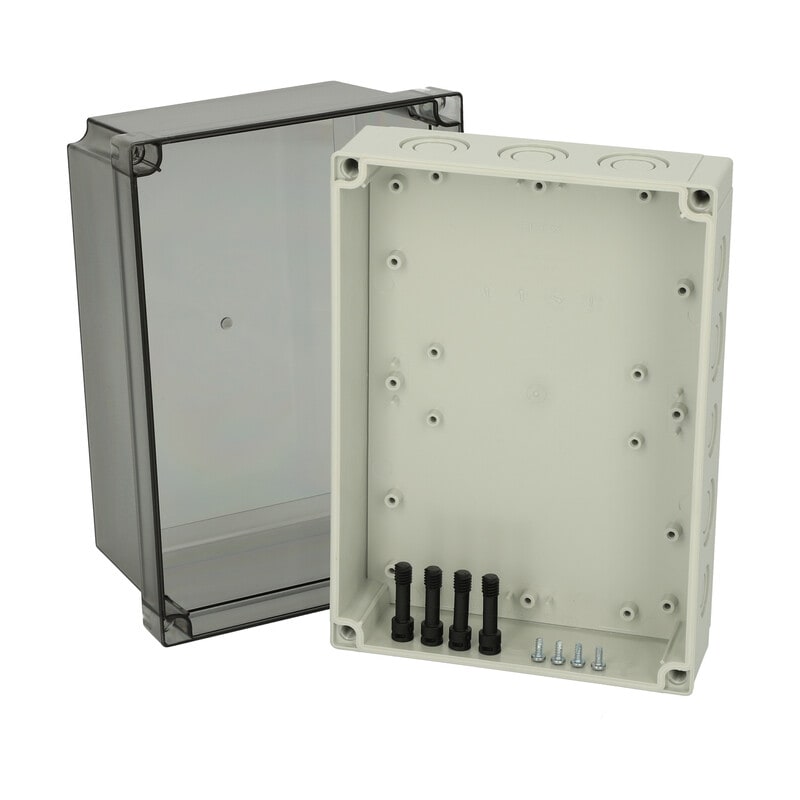 MNX PCM polykarbonaattikotelo, 255x180x150, metriset läpilyöntiaihiot, savunharmaa läpinäkyvä kansi, alaosa TPE-tiivisteellä, 4 kpl ruuvit asennuslevylle/DIN-kiskolle, 4 kpl polyamidi kansiruuvia, IP66/67, IK08