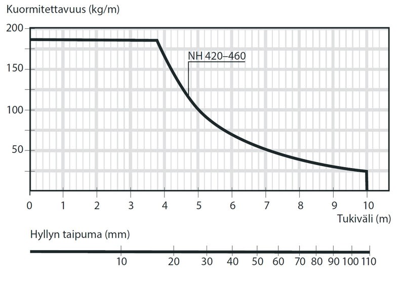 Turvallinen työkuorma IEC 61537:n mukaisesti, kun tukiväli on 10,0 m.: