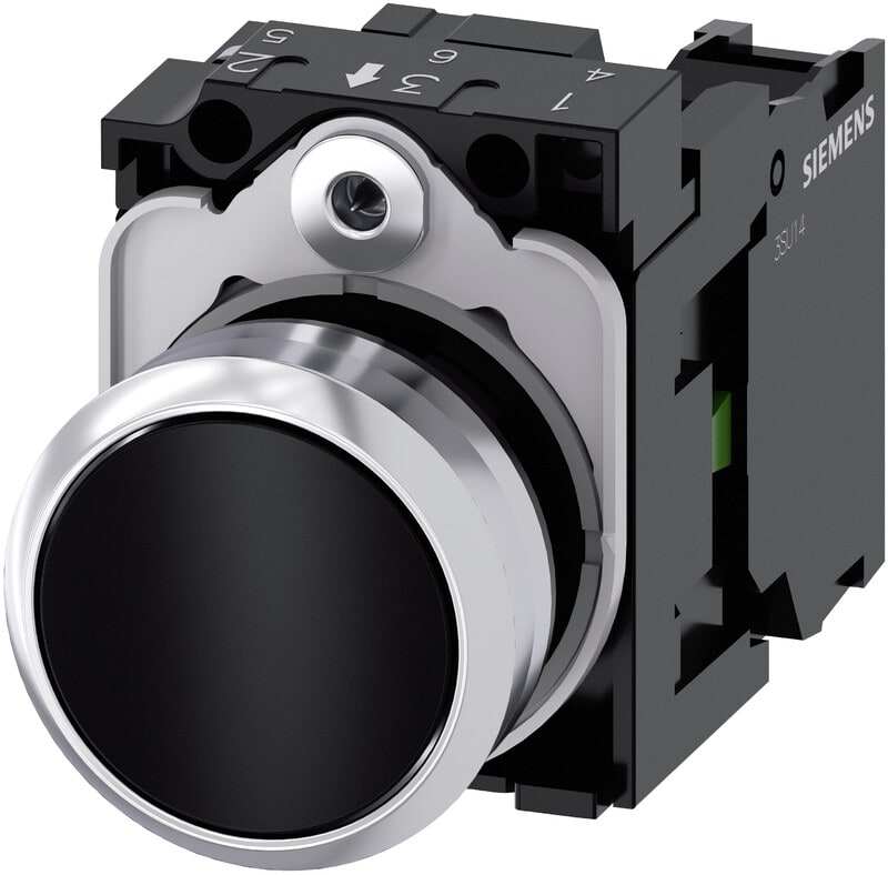 Painike, 22 mm, pyöreä, metalli, kiiltävä, musta, painonappi, litteä, hetkellinen kosketintyyppi, pidikkeellä, 1 NO, ruuviliitin