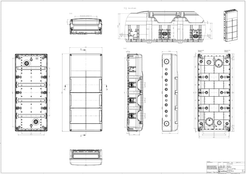 Moduulikotelo - teollisuusmalli -, laipan malli, avoimilla päädyillä, joissa voidaan käyttää erilaisia laippoja, useampien AK-F-moduulikoteloiden liittämiseksi yhteen yhdistyslaipan avulla, 3-rivinen, 42 moduulia, DIN-asennuskiskojen väli 150 mm, integroiduilla tuuletusventtiileillä kondenssiveden muodostumisen vähentämiseksi, DIN-peitelevy ja merkintäliuska, ylimääräisillä kaksoiskalvotiivisteillä ja muilla tarvikkeilla, laipat ja yhdistyslaipat on hankittava erikseen.