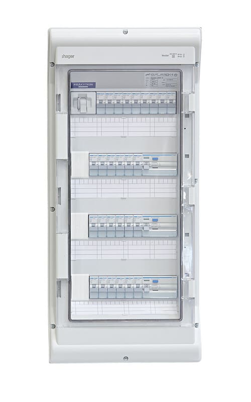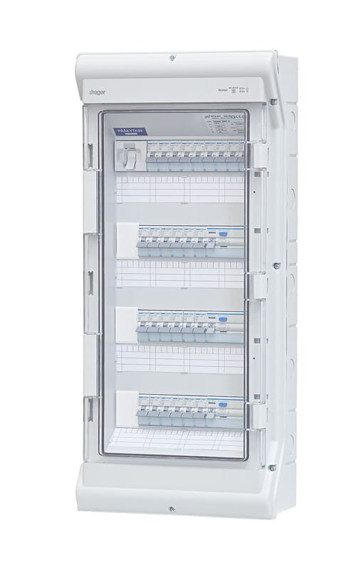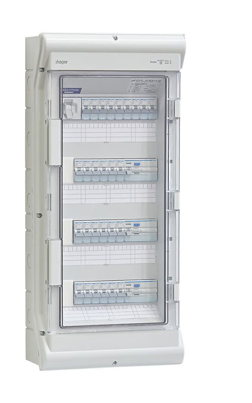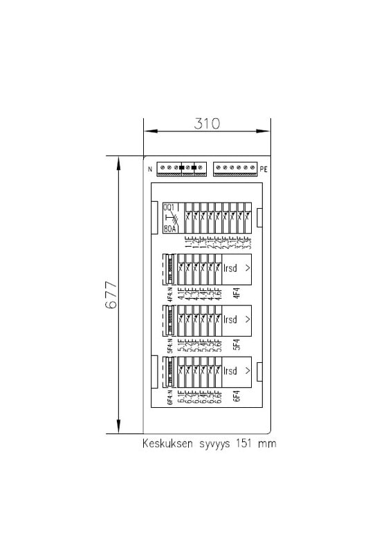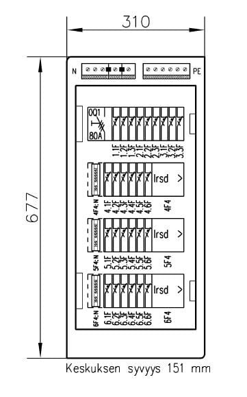 Ryhmäkeskus IP44. Pinta-asennukseen. ovella. Kotelo polystyreeniä.Nimellisvirta 50A. Johdonsuojakatkaisijoita 27 kpl. vikavirtasuojakytkin3 kpl (4-nap. 30 mA 25A). HUOM! KESKUSTA EI SAA ASENTAA ULOS Ryhmäkeskus IP44. Pinta-asennukseen, ovella. Kotelo polystyreeniä. Nimellisvirta 50A. Johdonsuojakatkaisijoita 27 kpl, vikavirtasuojakytkin 3 kpl (4-nap. 30 mA 25A). Keskuksessa on kalvotiivisteet, tuuletustulppa sekä läpivientiaihiot ylä- ja alapäädyssä. HUOMIO! Keskusta ei saa asentaa ulos. Kun keskus asennetaan kosteaan tilaan tai olosuhteisiin, joissa esiintyy suuria lämmönvaihteluja: 1. on käytettävä tuuletustulppaa (toimitetaan keskuksen mukana) 2. kaapelit on tuotava koteloon alakautta