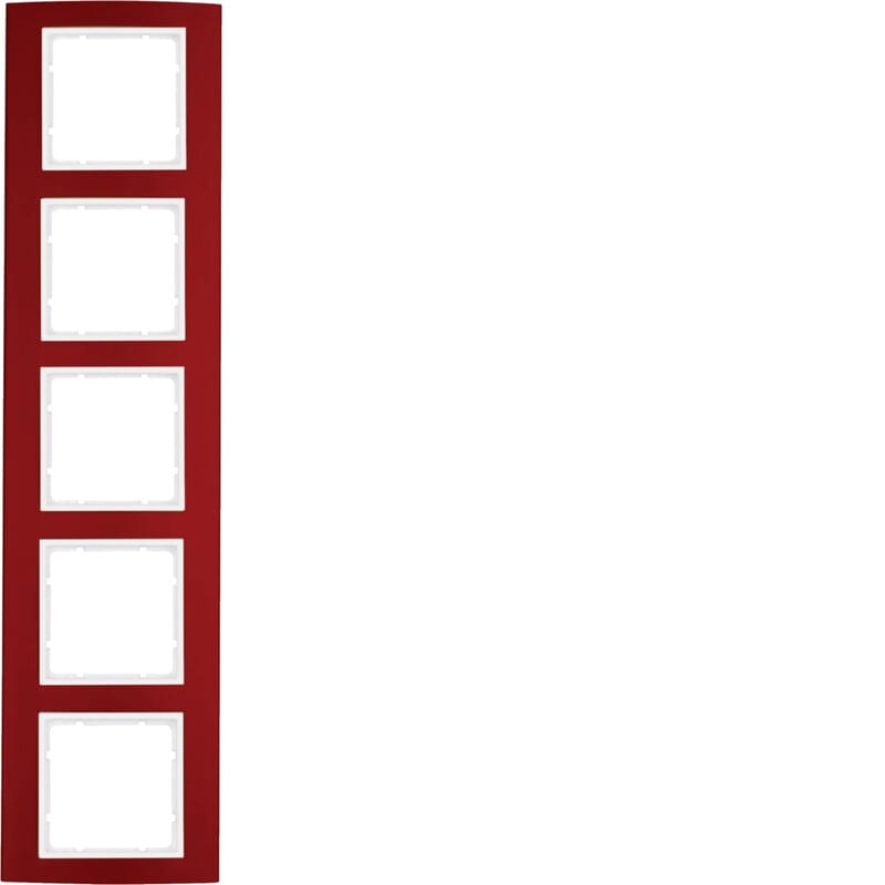 Peitelevy Hager B.3 5os. 81mm punainen-Al/puhtaanvalkoinen Peitelevy Berker B.3, 5-osainen. Pintamateriaali punaiseksi anodisoidusta alumiinista ja puhtaanvalkoinen pohjalevy halogeenittomasta thermoplast-muovista. Käyttö Berker S.1 -kalustesarjan valkoisella 55x55 keskiölevyllä varustettujen kojeiden kanssa.