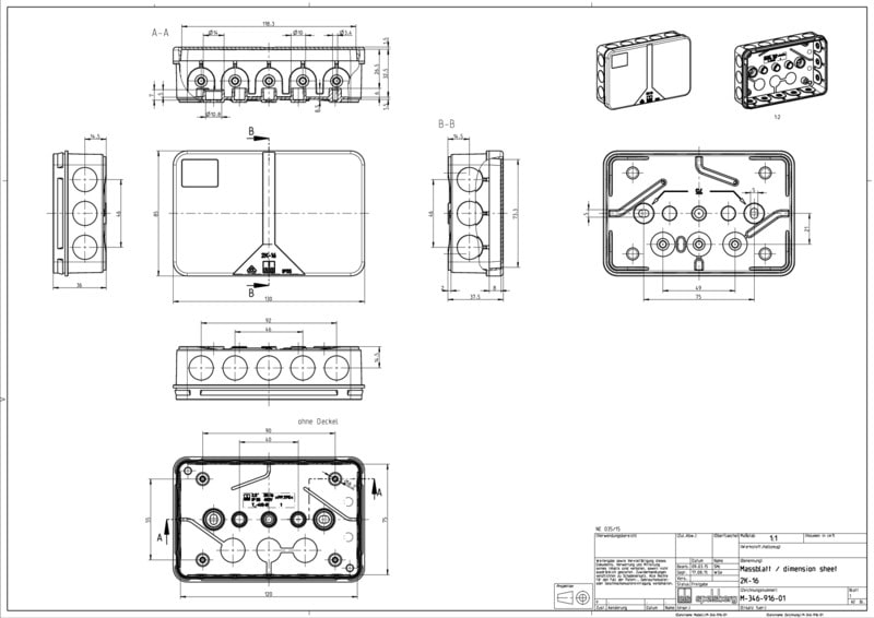 Jakorasia standardin DIN EN 60670 mukainen (VDE 0606), 16 läpivientiä, kolme läpivientiä pohjassa, kalvotiivisteillä, pehmeät läpivientikalvot, työkalua kaapelin läpiviennin avaamiseen ei tarvita, 2 - 14 mm kaapeleille, sisäpuoleiset kiinnityspisteet