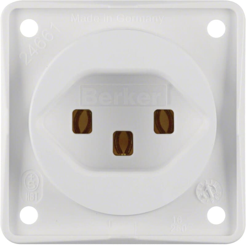 Pistorasia maadoituskoskettimella SVEITSI tyyppi 23 puhtaanvalkoinen matta Pistorasia maadoituskoskettimella SVEITSI tyyppi 23 - ruuviliittimet Nimellisjännite 250 VAC Nimellisvirta 16 A Ei sovellu kiinnitykseen kiristysrenkaalla! Kytkentäliittimet IEC 60884-1 mukaan ? 2-napainen + maadoitus