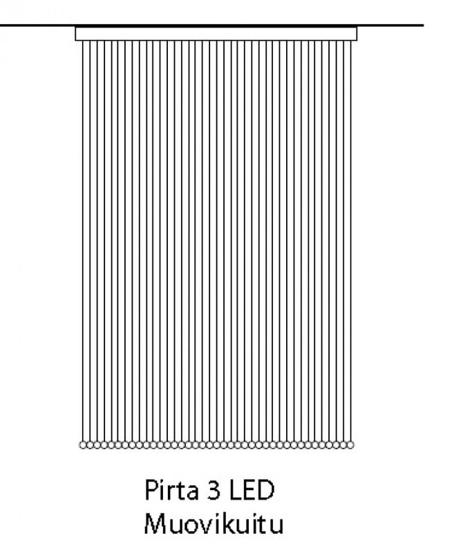 Pirta Flat -valokuituverho on asennusvalmis kokonaisuus, jossa kuidut on asennettu valaisinrunkoon ja kristallit kuitujen päihin.