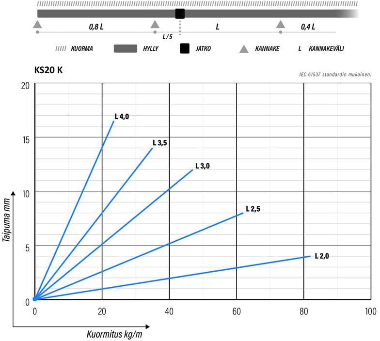 IEC 61537:n mukainen turvallinen työkuorma, kun tukiväli on 2,0 m.:
