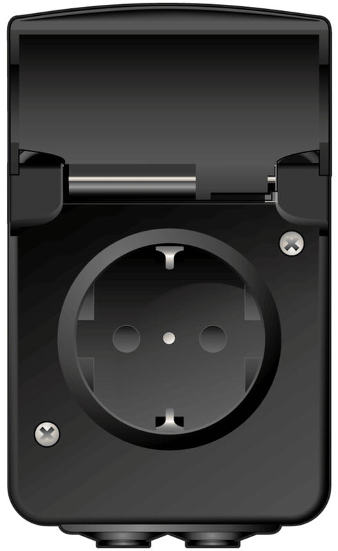 Pinta-asennettava 1-osainen maadoitettu pistorasia turvasuluin. Kotelointiluokka IP44. Pistorasiassa on ruuviliittimet. Liittimet ovat hyväksytty sekä ML että MK johtimille. Pistorasiassa on kalvoläpiviennit kaapeleille ylhäällä ja alhaalla.
