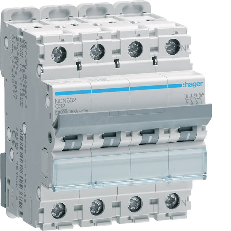 HAGER - Johdonsuojakatkaisija 32A 10kA - NCN632 3L+N C-32A 10kA 4M