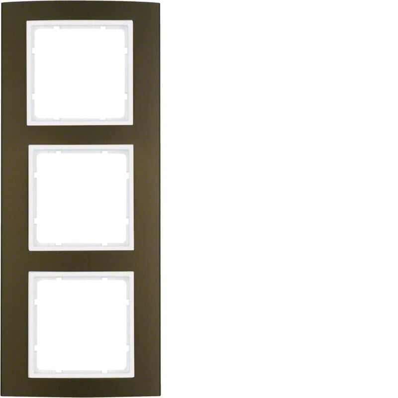 Peitelevy Hager B.3 3os. 81mm ruskea-Al/puhtaanvalkoinen Peitelevy Berker B.3, 3-osainen. Pintamateriaali ruskeaksi anodisoidusta alumiinista ja puhtaanvalkoinen pohjalevy halogeenittomasta thermoplast-muovista. Käyttö Berker S.1 -kalustesarjan valkoisella 55x55 keskiölevyllä varustettujen kojeiden kanssa.