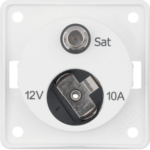 Pistorasia 12 V + SAT puhtaanvalkoinen matta Pistorasia 12 V + SAT Nimellisvirta maks. 10 A Käyttöjännite 12 VDC Ei soveltuva peitelevyille saranoiduilla kansilla. Sateliitti-TV -signaalien vastaanottoon ja samanaikaisesti soveltuvien TV-laiteiden tehonsyöttöön. − kaksois F-pistokkeella − jousiliittimillä pikakiinnitykseen