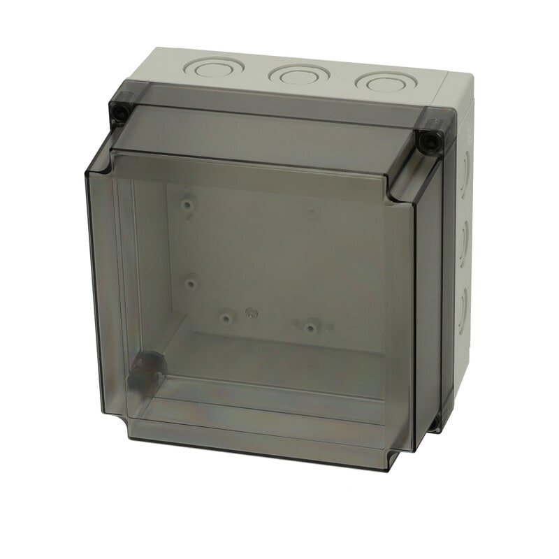 MNX PCM polykarbonaattikotelo, 180x180x125, metriset läpilyöntiaihiot, savunharmaa läpinäkyvä kansi, alaosa TPE-tiivisteellä, 4 kpl ruuvit asennuslevylle/DIN-kiskolle, 4 kpl polyamidi kansiruuvia, IP66/67, IK08