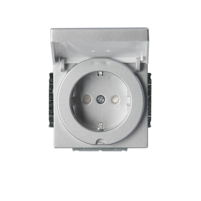 Pistorasia, Impressivo, 1-osainen, maad, jousiliittimin, alumiini Uppoasennettava pistorasia. Pistorasiassa on liittimet kahdelle johdolle kutakin kosketinta kohden. Ei lisäliittimiä. Liittimet on hyväksytty ML ja MK johtimille.
