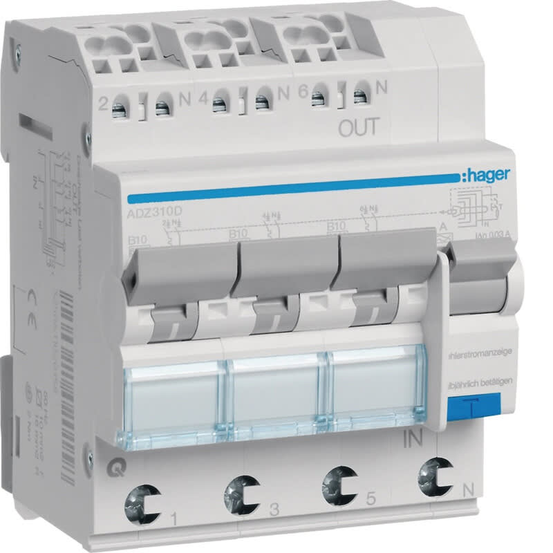 HAGER - Vikavirtajohdonsuojakatkaisija - ADZ310D 30mA A/3xL+N B-10A 6kA