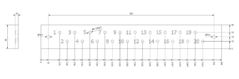 OUNEVA - 10x80x600, 20 reikää 9mm - AE06-1685 PE-kisko Cu