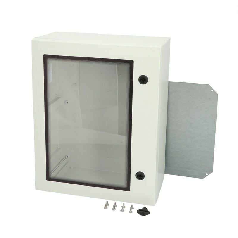 Sisältää : Kaapin alaosa, ovi PUR tiivisteellä ja ikkunalla, asennuslevy, ruuvit asennuslevylle. 3mm kaksoislehtilukko(t) avaimella. S versiot kääntökahvalla. Oviohjain sisältyy. IP65; IK08
