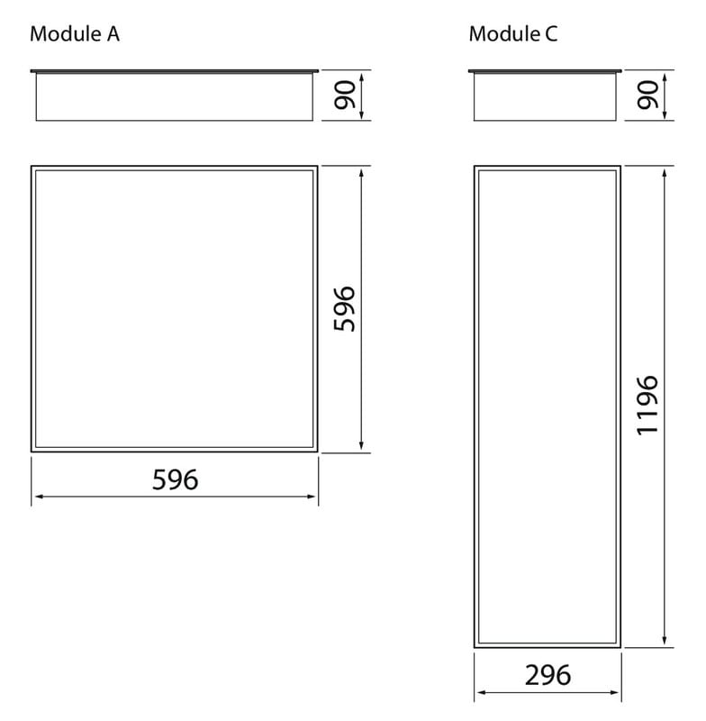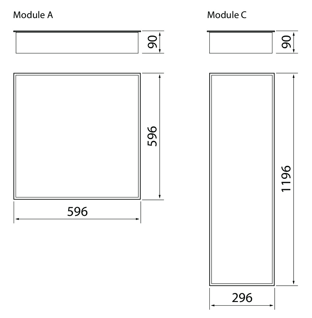 - Lisätarvikkeina yleisuppoasennuskehys 600 x 600 (4297811), yleisuppoasennuskehys 1200 x 300 (4297812) ja pinta-asennuskehys 600 x 600/143 mm (4245223).