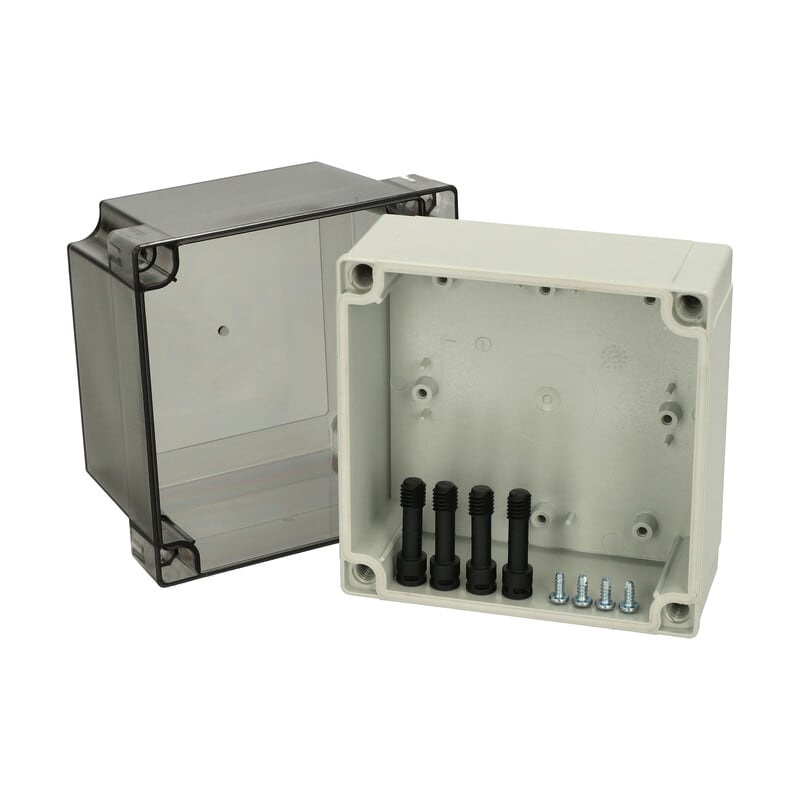 MNX PC polykarbonaattikotelo, 130x130x125, Korkea alaosa, Savunharmaa läpinäkyvä kansi, Alaosa ilman läpilyöntiaihioita, Alaosa TPE-tiivisteellä, 4 kpl ruuvit asennuslevylle/DIN-kiskolle, 4 kpl mustaa polyamidi kansiruuvia, IP66/67, IK08 FIBOX MNX PC polykarbonaattiasennuskotelot
