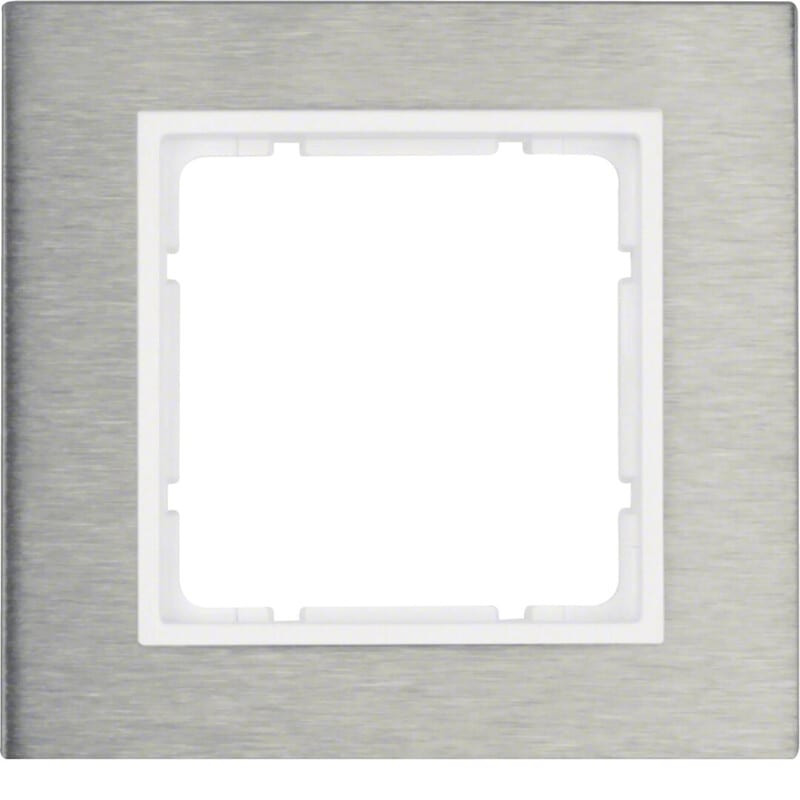 Peitelevy Hager B.7 1os. 95mm harjattu RST/puhtaanvalkoinen Peitelevy Berker B.7, 1-osainen. Pintamateriaali ruostumattomasta teräksestä pystyharjatulla pinnalla ja puhtaanvalkoinen pohjalevy halogeenittomasta thermoplast-muovista. Käyttö Berker S.1 -kalustesarjan valkoisella 55x55 keskiölevyllä varustettujen kojeiden kanssa.