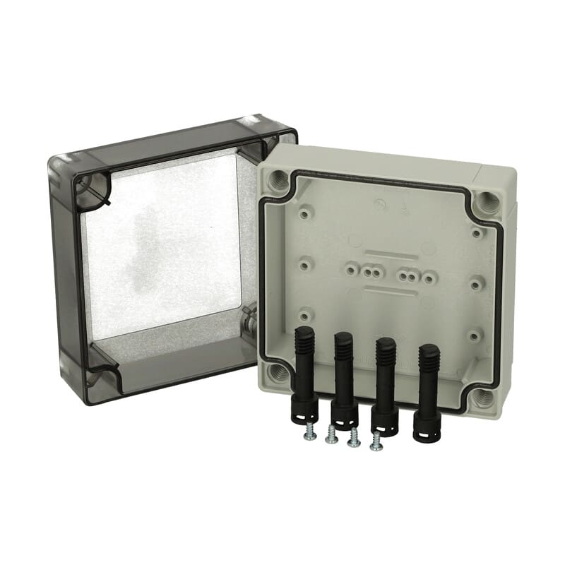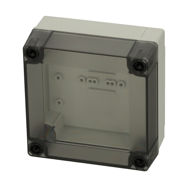 MNX PC polykarbonaattikotelo, 100x100x50, Matala alaosa, Savunharmaa läpinäkyvä kansi, Alaosa ilman läpilyöntiaihioita, Alaosa PUR-tiivisteellä, 4 kpl ruuvit asennuslevylle/DIN-kiskolle, 4 kpl mustaa polyamidi kansiruuvia, IP66/67, IK08 FIBOX MNX PC polykarbonaattiasennuskotelot