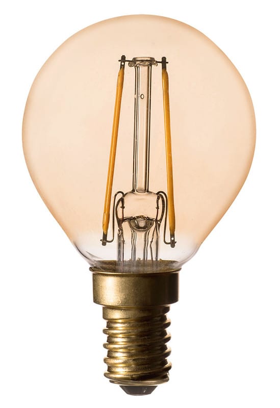 Kirkas pienkupuinen filamentti led-lamppu 2,5W 2200K E14 225lm 15000h 45x80mm, kupu lasia, kuvun väri Amber, pahvipakkaus. Taajuus ~50/60Hz.