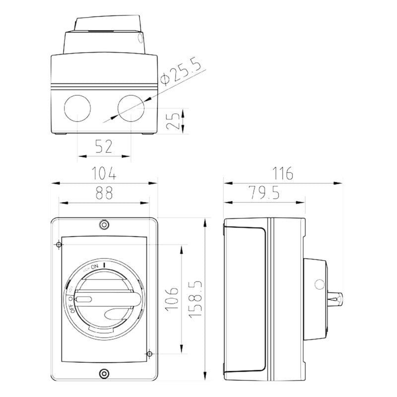 Sisältää:Kytkimen: KU 325 (3609692) | Kaapelin koko kytkentätilaan (vain Cu): 1,5-16 mm2 | Apukoskettimen: KU1V (3600490) Kaapeliläpiviennit: 2 x M25 (11-17mm) EMC-suojattu metalli + 1 x M16 (5-10mm) metalli Läpivientien asennussuunnat ilmoitettava tilattaessa!