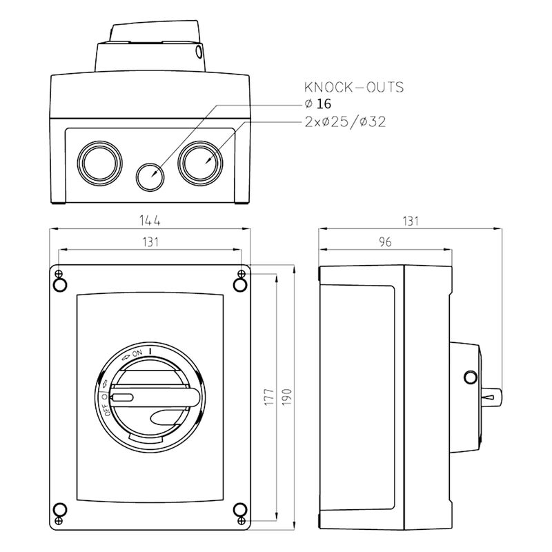 Sisältää:Kytkimen: KU 480N (3635105) | Kaapelin koko kytkentätilaan (vain Cu): 2,5-35 mm2 | Apukoskettimen: KU1V (3600490) Kaapeliläpiviennit: 2 x M32L (18-25mm) muovi + 1 x M16 (5-10mm) muovi